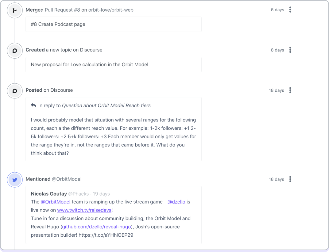 Orbit’s GitHub integration syncs with all of your orgs and repos (you can choose which ones), and import Members and Activities across each of them.